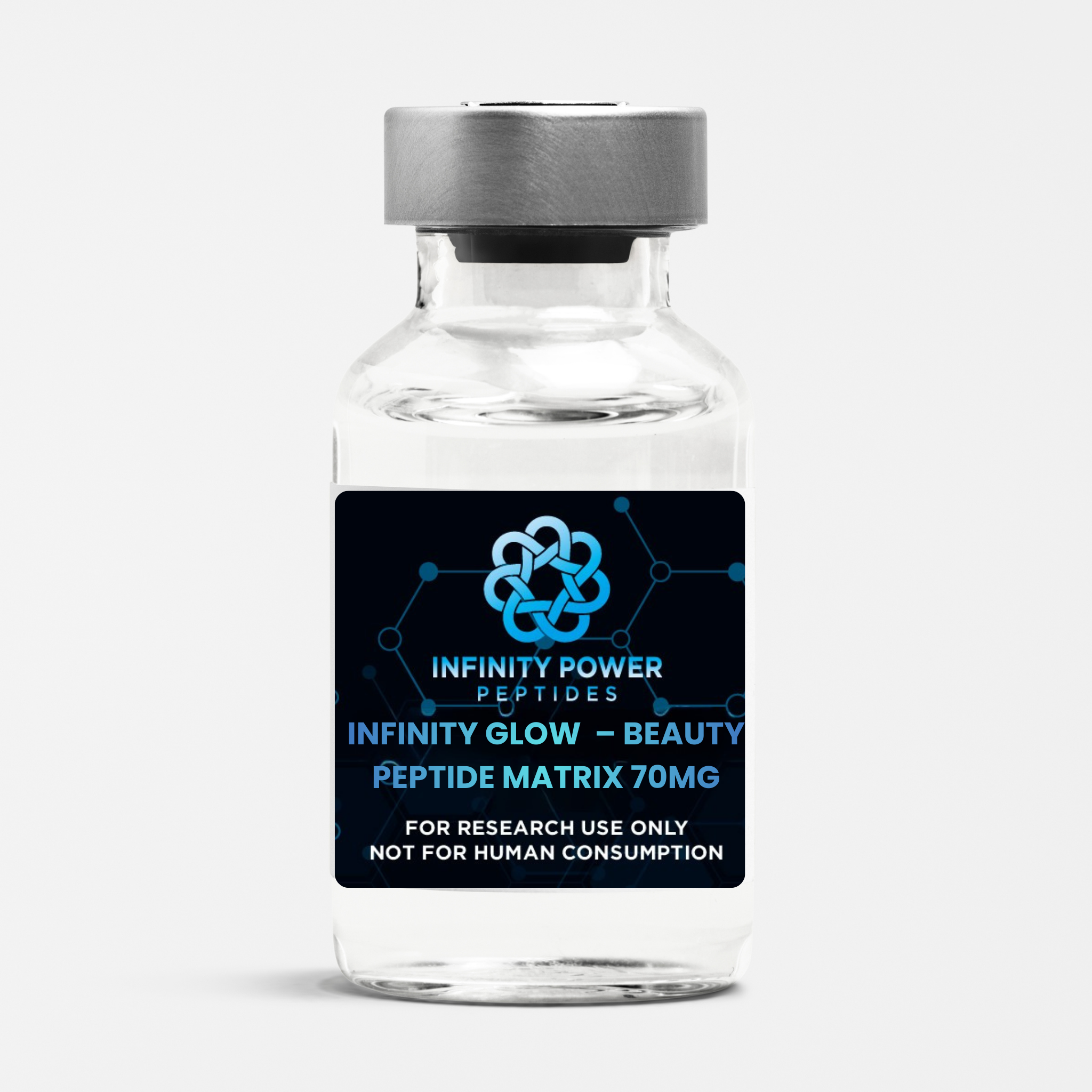 Infinity Glow is a premium cosmetic-research peptide formulation supplied as a sterile, lyophilized powder for laboratory use. This peptide matrix is designed for advanced studies focused on skin rejuvenation mechanics, collagen signaling pathways, and youthful appearance research. Each vial is produced in GMP-compliant conditions with strict quality standards to ensure consistency, purity, and reliability for research environments.