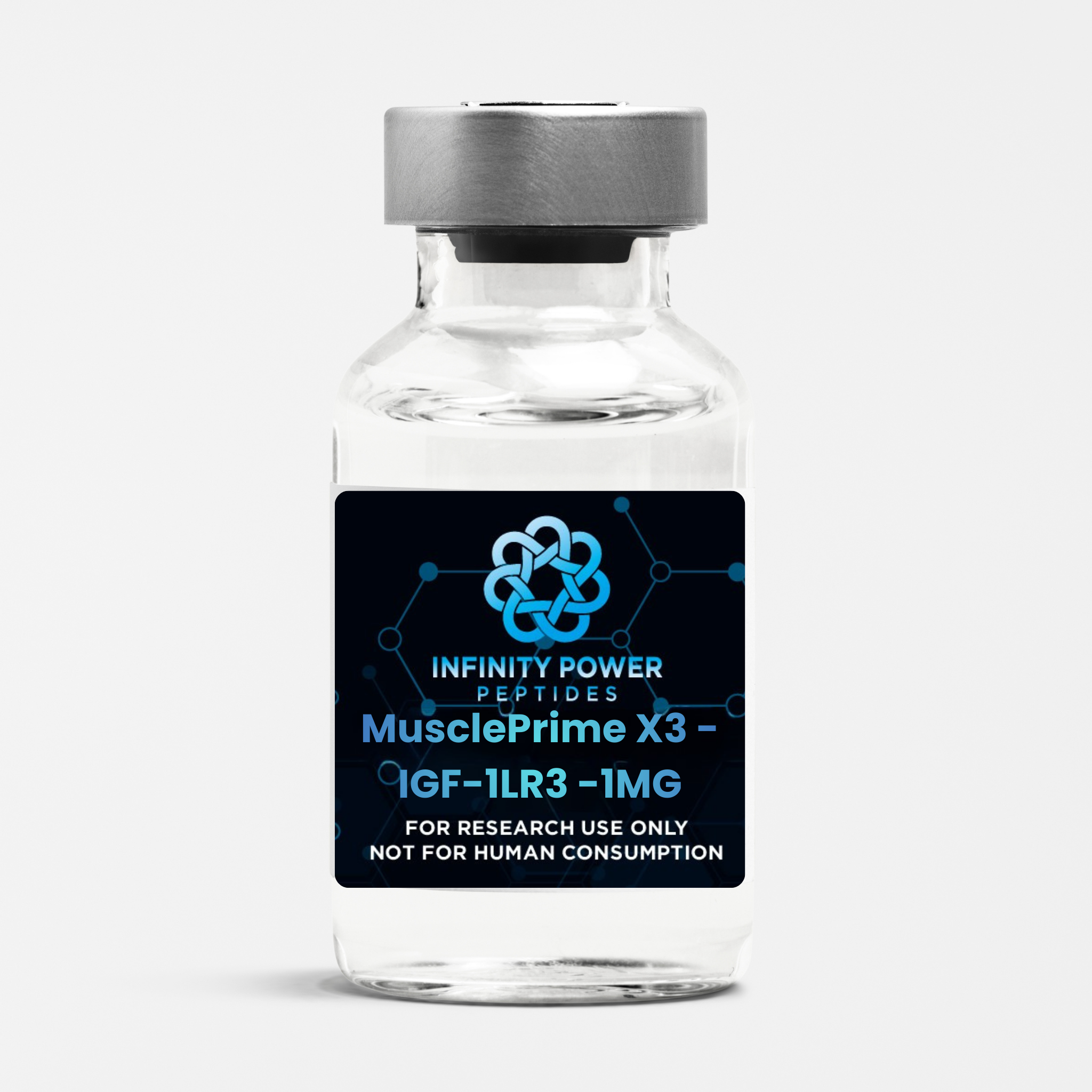 Infinity IGF-LR3 (IGF-1 LR3) is a research-grade synthetic peptide supplied as a sterile, lyophilized powder for laboratory use. Each vial contains 1mg IGF-1 LR3 and is manufactured in a GMP-compliant facility with strict production controls and lot-level documentation.